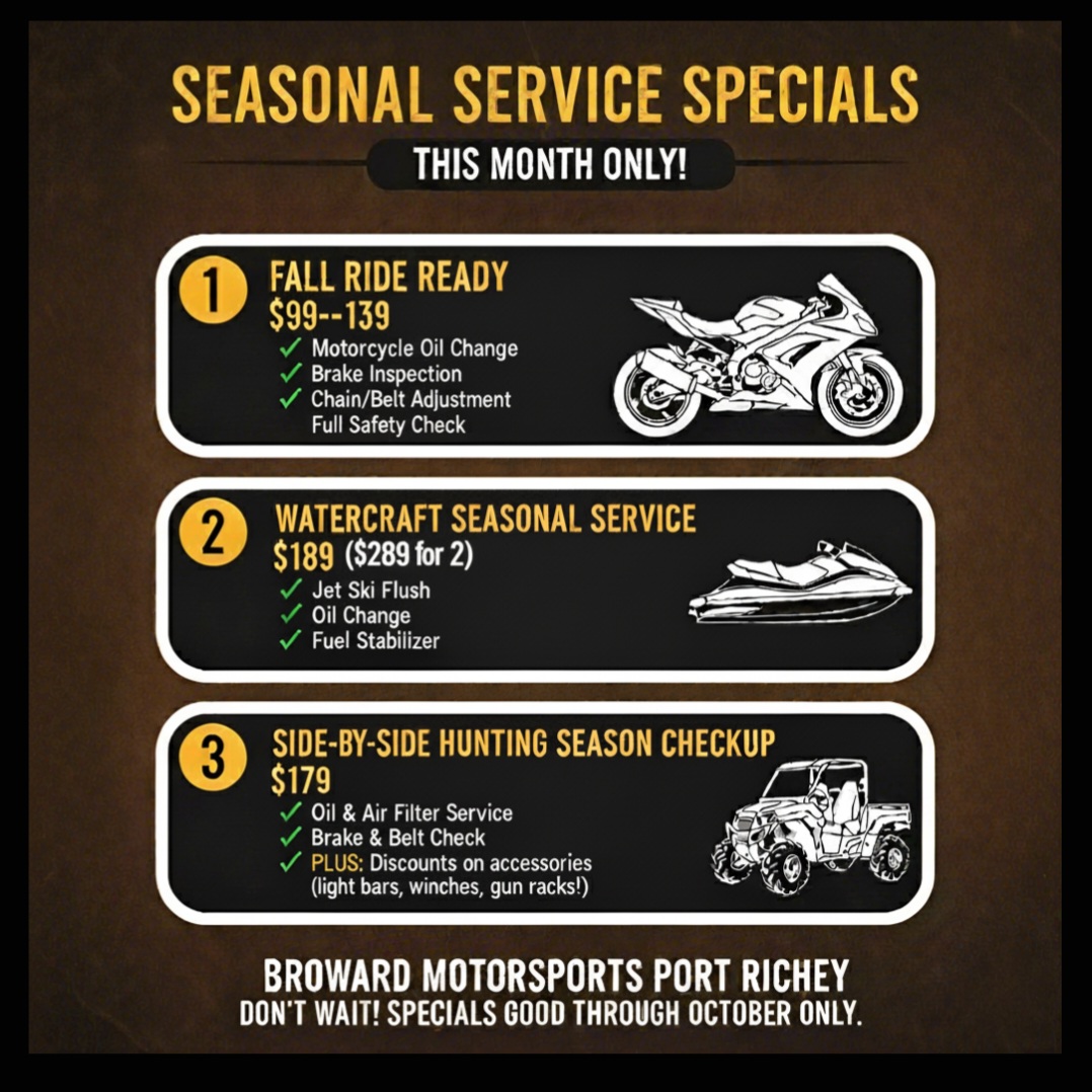 Welcome to Broward Motorsports Port Richey Service Specials page! Our team is here to offer you great deals on comprehensive services for your motorsports vehicles. Whether you're looking for maintenance or upgrades, we've got you covered. Explore our specials and see how our expert service can enhance your riding experience. Join us in elevating your adventure with top-tier care for unmatched performance and safety.