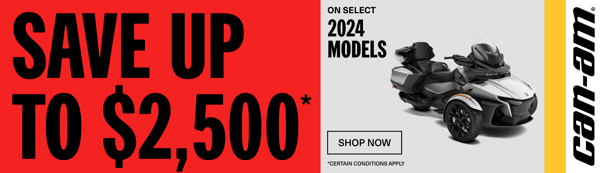 ©2025 Bombardier Recreational Products Inc. (BRP). All rights reserved. ®, ™ and the BRP logo are trademarks of BRP or its affiliates. In the U.S.A., products are distributed by BRP US Inc. Offers valid in U.S.A. only between November 1, 2025 - January 31, 2026. The conditions may vary depending on your location and this offer is subject to termination or change at any time without notice. This offer is not refundable, exchangeable or transferable (including from one dealership to another), cannot be redeemed for cash, credit or other products of equivalent value. Null where prohibited by law. Until supplies last. Eligible units are all new and unused 2024 Can-Am 3-Wheels models. Other Can-Am On-Road models may qualify for other promotions, see local dealers for details.