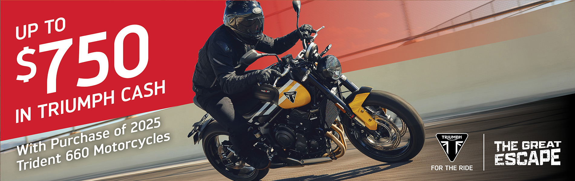 The Great Escape promotion offers bold incentives for riders to escape high interest rates on the purchase of a new Triumph motorcycle, with the lowest financing rates in the industry.